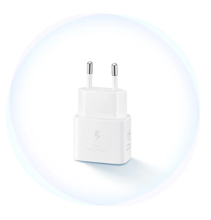 * Super Fast Charging (SFC) este metoda de încărcare Samsung bazată pe Power Delivery 3.0. ** SFC este acceptat pentru Galaxy Note (Note10 și versiuni ulterioare), Galaxy S Series (S10 5G și versiuni ulterioare) și alte dispozitive compatibile SFC. *** Pentru rezultate optime, te rugăm să le utilizezi cu cabluri Samsung autentice, care pot fi achiziționate separat. **** Cablul de încărcare este inclus, în funcție de model.